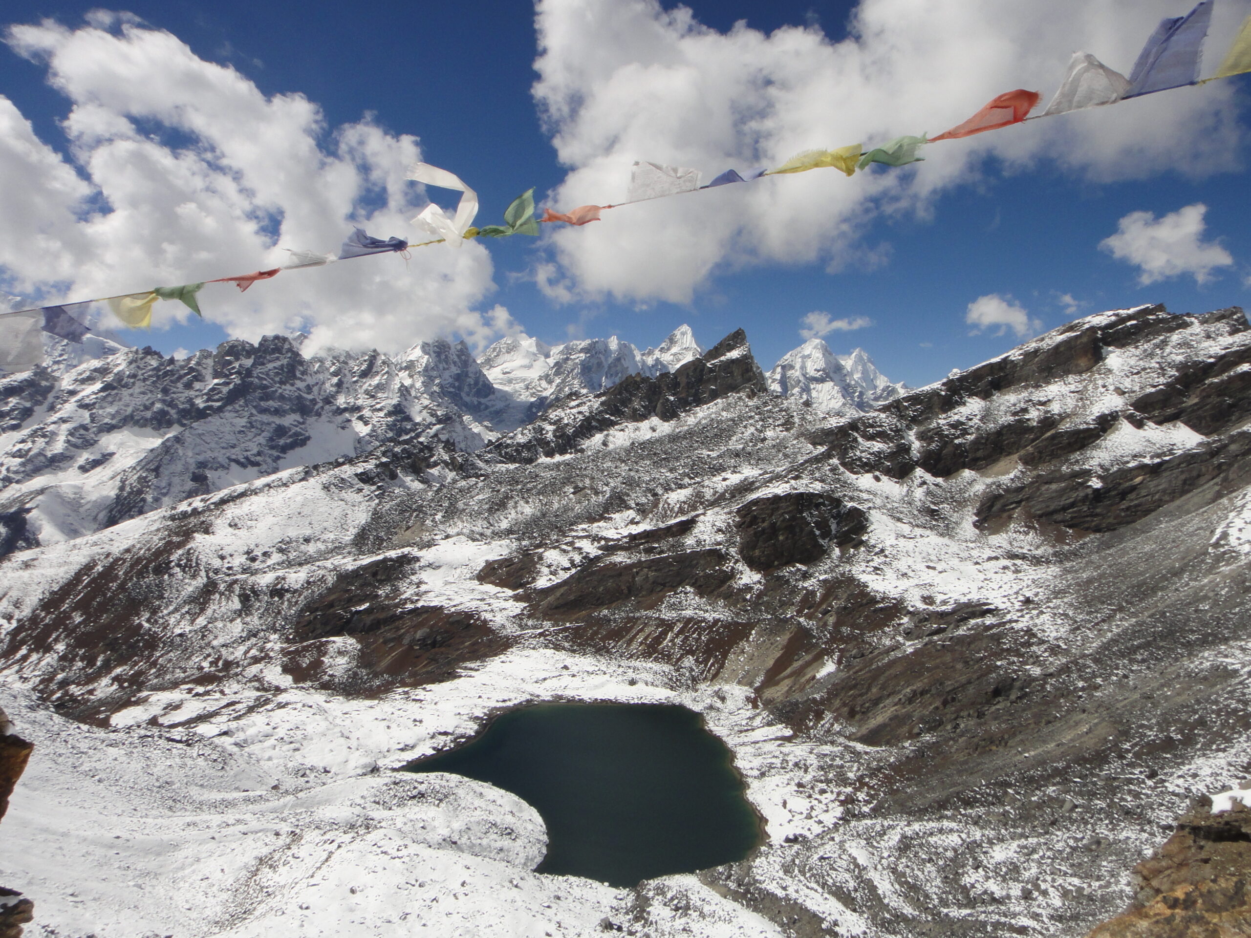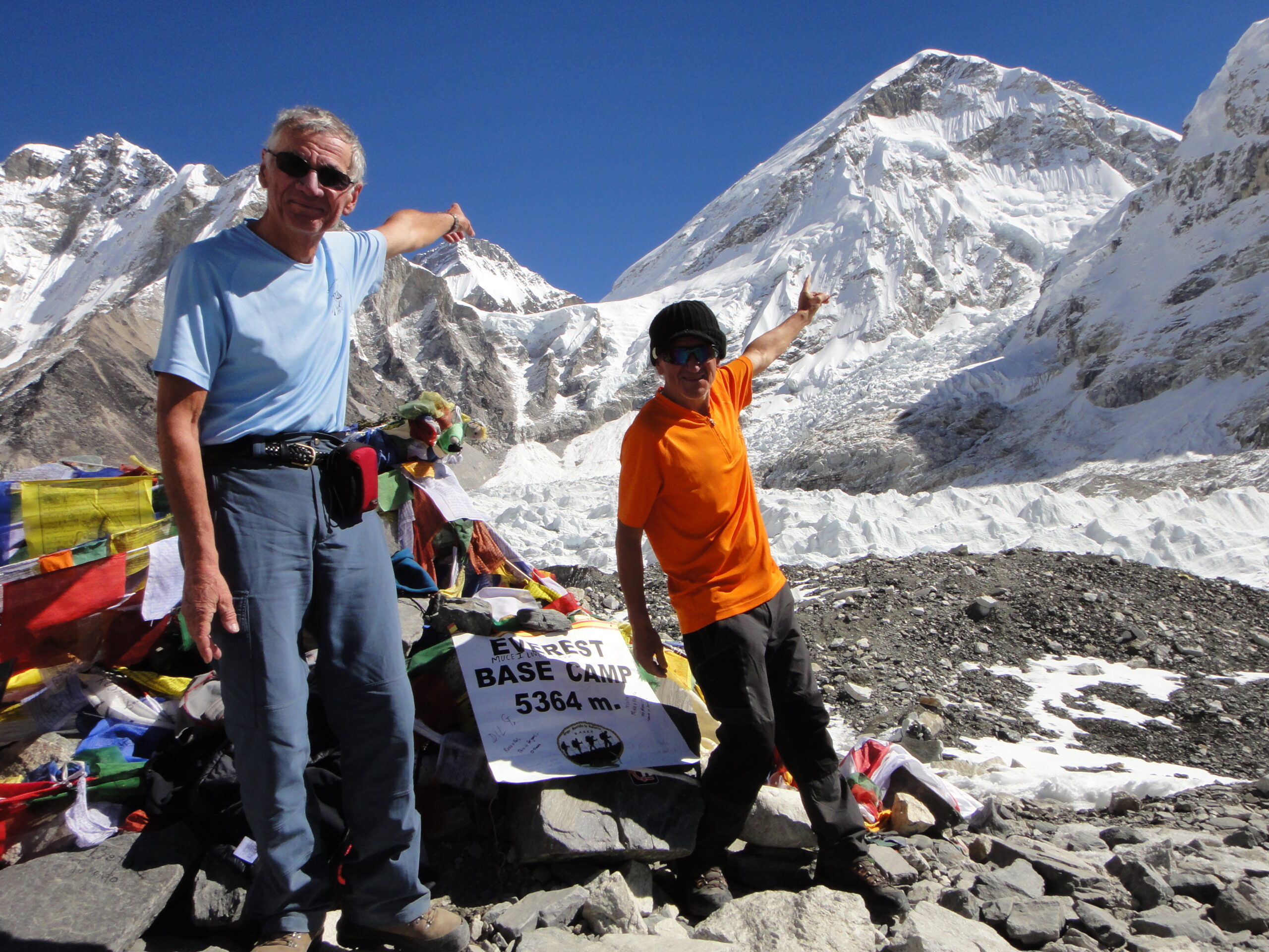 Le chemin longe les vallées d’ablation et franchit les moraines du glacier pour arriver à Gorak shep. Cheminement chaotique dans les moraines pour gagner le camp de base de l’Everest au pied de la combe ouest redoutable « Ice face ». Découvrons ce village de tentes multicolores peut confortable, point de départ du plus haut sommet. Beaucoup d’entre nous se poseront maintes questions : sur ce pourquoi aller la haut ! Après bien de méditations devant ce paysage fantastique. Retour sur Gorak Shep.