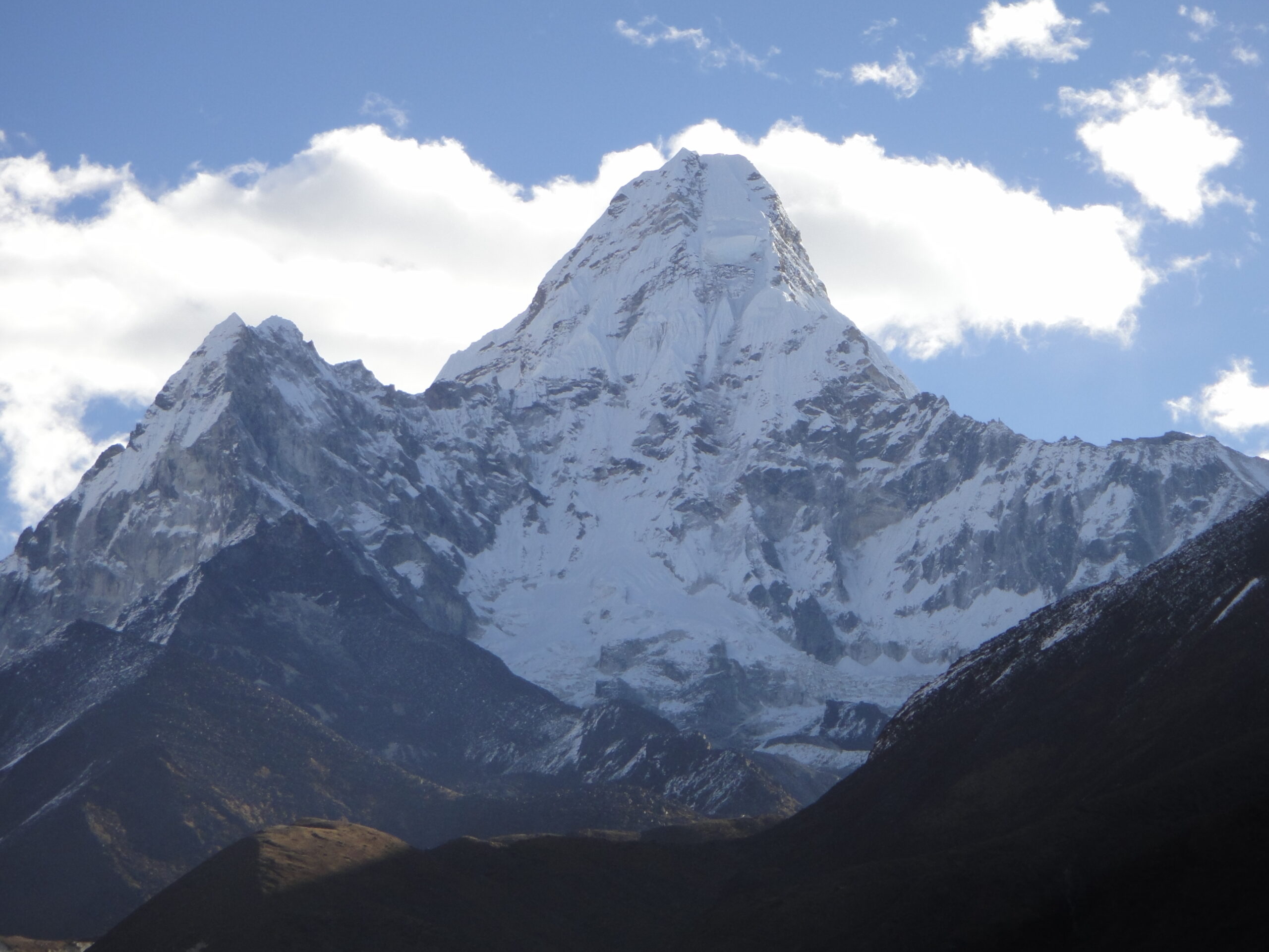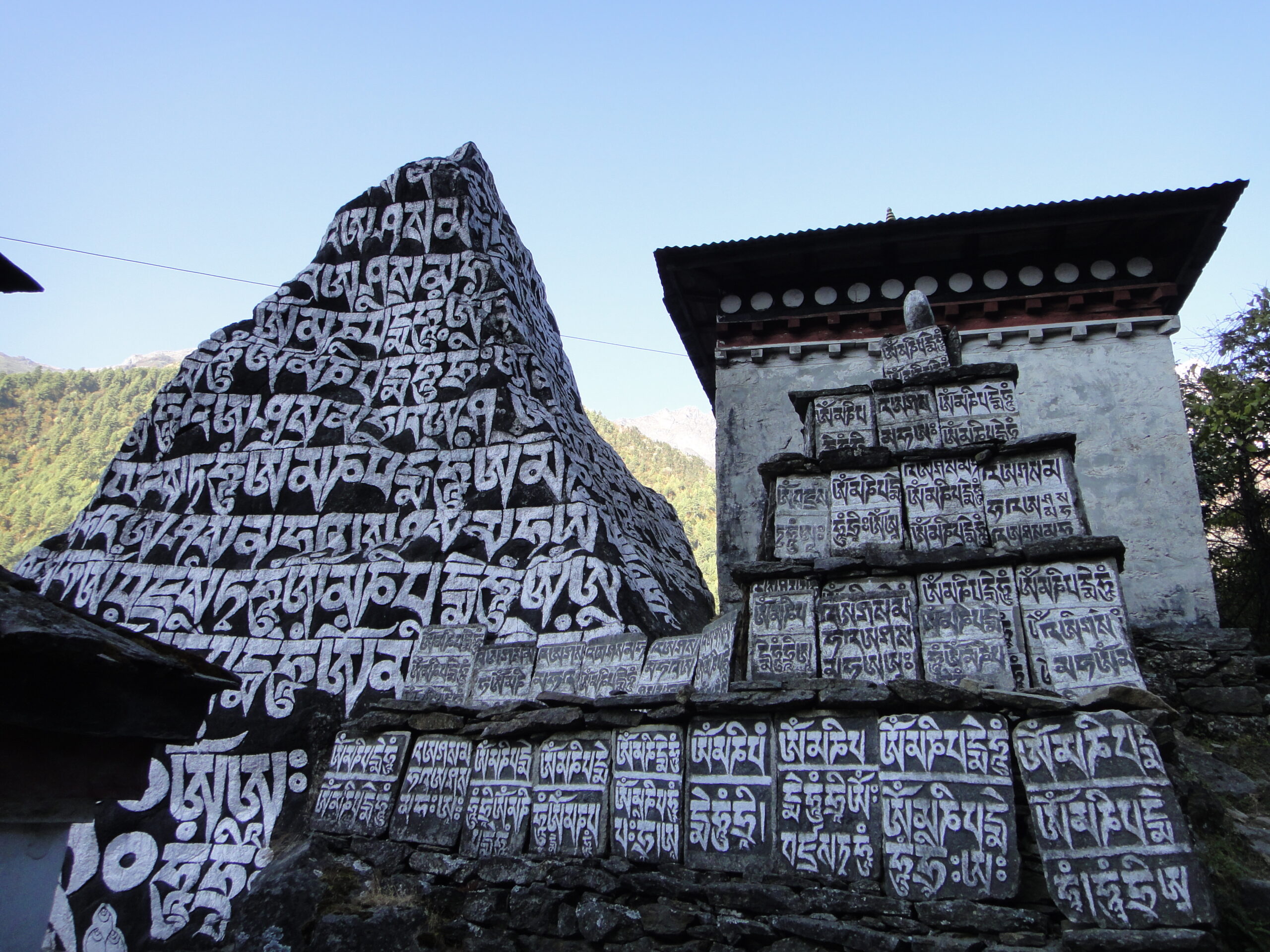 Regard songeur sur la stèle dédiée (aux alpinistes, sherpas et porteurs), traversée de Pangboche (super vue sur l’Ama Dablan) montée (chortens), Debuche vue sur la vallée. Descente dans les gorges, traversée d’une rivière par un pont. Montée harde sur un sentier en balcon.
